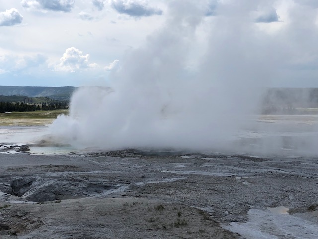 If memory serves, I promised to write a tad more about my recent adventures in Yellowstone National Park…  The east entrance is a reasonable drive from Cody, Wyoming.  This year the park was celebrating its 147th year (being open to the public) but I think the place is actually a few years older.  (11 or 12 million years at the very least!)  The park encompasses about 2.2 million acres, and as many of you know, it contains more geysers than any other spot on earth.  (We had a few old geysers on our bus, but they seldom “spouted off!”)  Wait a minute, make that “old geezers” not “old geysers.”